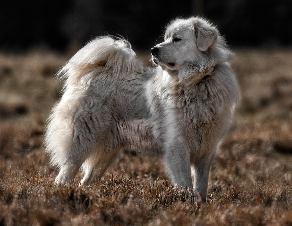 A livestock guardian dog on duty guarding sheep in the pasture near Franklinville, North Carolina.