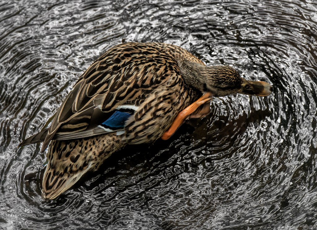 A Muscovy duck suns itself on a rock in Deep River yesterday afternoon in Franklinville, North Carolina.