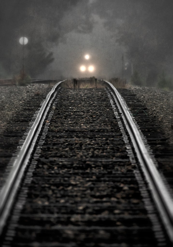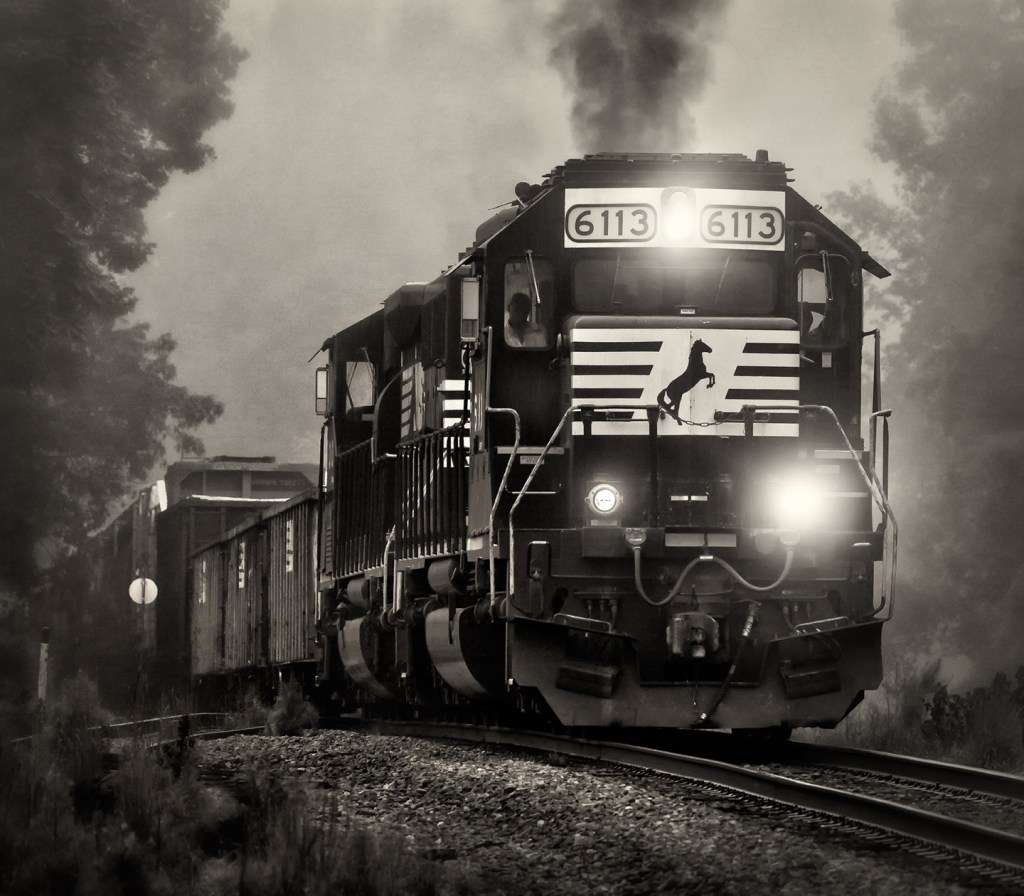 A Norfolk and Southern freight train pulls out of Climax, North Carolina on a foggy morning.