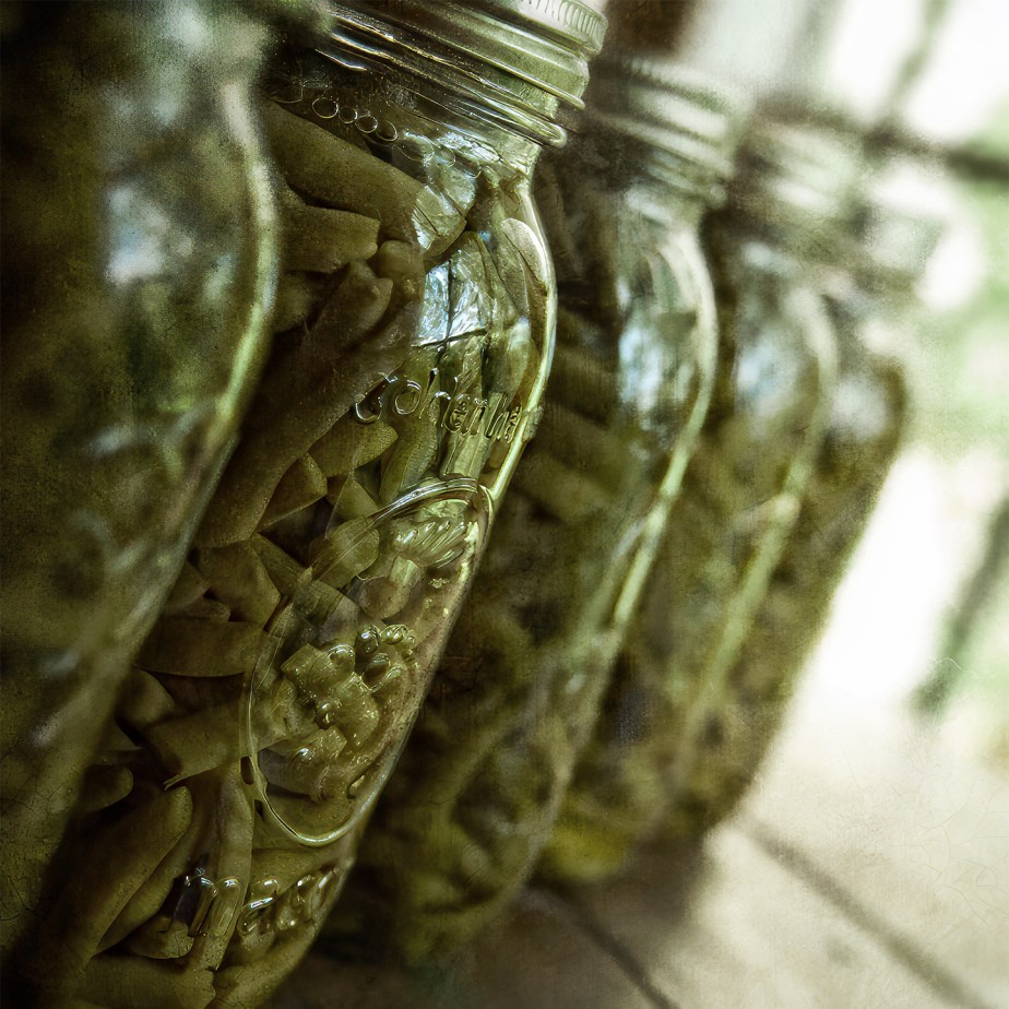 Still life of canned beans, part of next winter’s larder. On the green table.