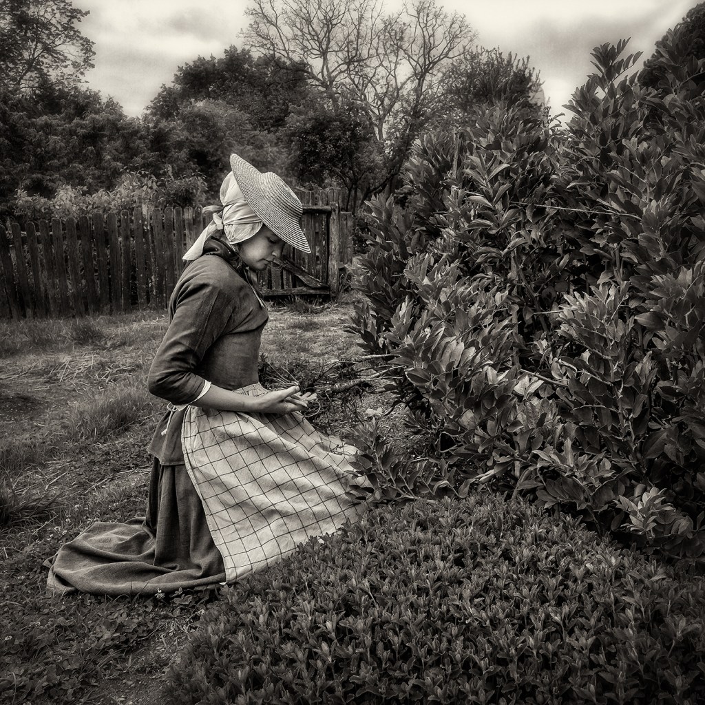 Gathering vegetables behind the Miksch House in Old Salem Museum and Gardens. Winston Salem, North Carolina.