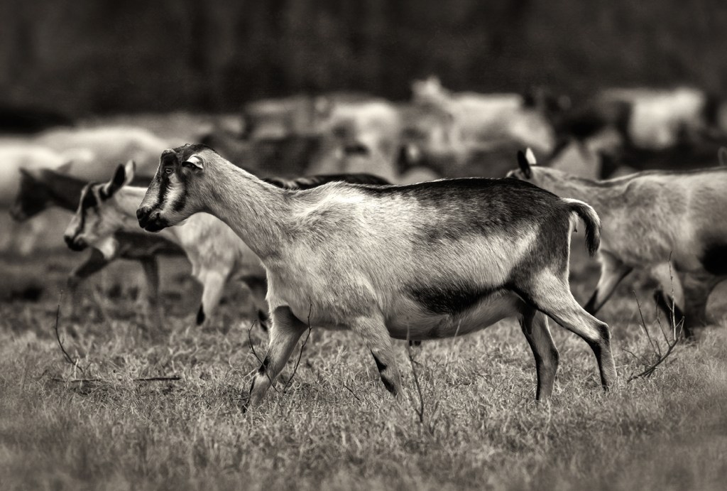Milk goats on the way to pasture. Lindale Organic Dairy. Silk Hope, North Carolina.