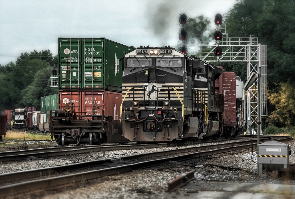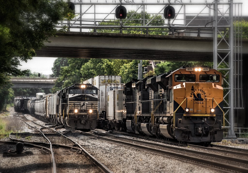 Norfolk Southern heritage unit 1071, Jersey Central Lines, leads an intermodal past a NS 9615 lead mixed freight consist that had tied down temporarily for a crew change just off Pomona Yard in Greensboro, North Carolina.