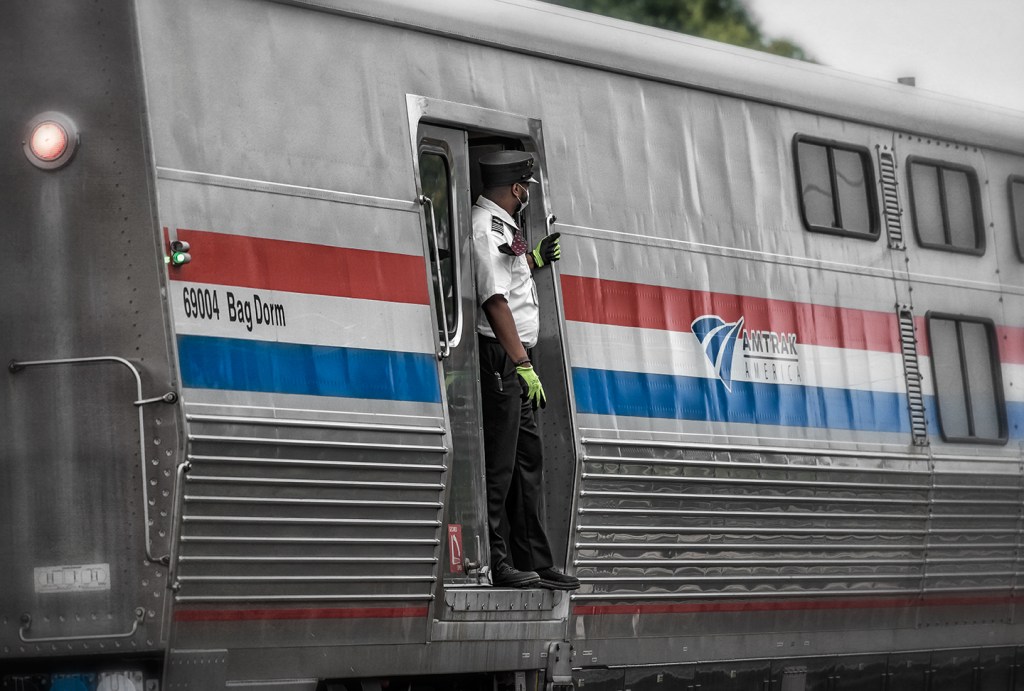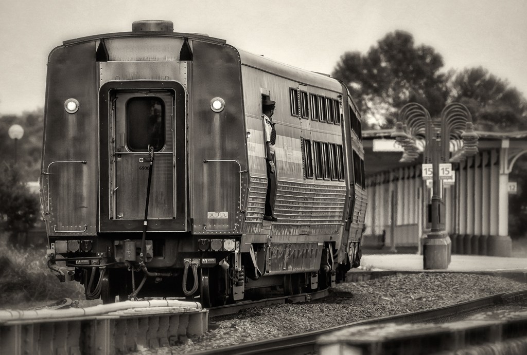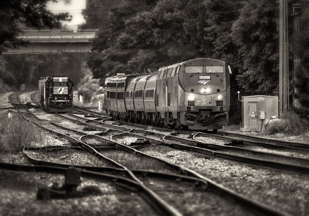 The Amtrak Crescent moves toward the station in Greensboro, North Carolina.