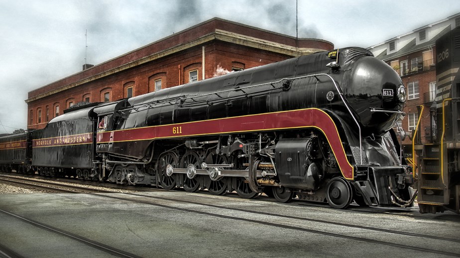 Norfolk Western 611 in tow by Norfolk Southern 1206 moves through the Elm Street crossing in Greensboro this morning on it’s ferry move from the Noth Carolina Transportation Museum in Spencer, NC to Strasburg, PA.