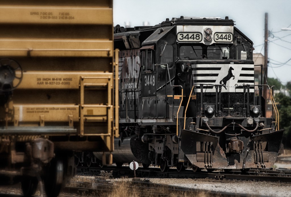 NS 3524 and NS 3448 on switching duty and a six unit consist pulling a mixed freight manifest. Pomona Yard. Greensboro, North Carolina.