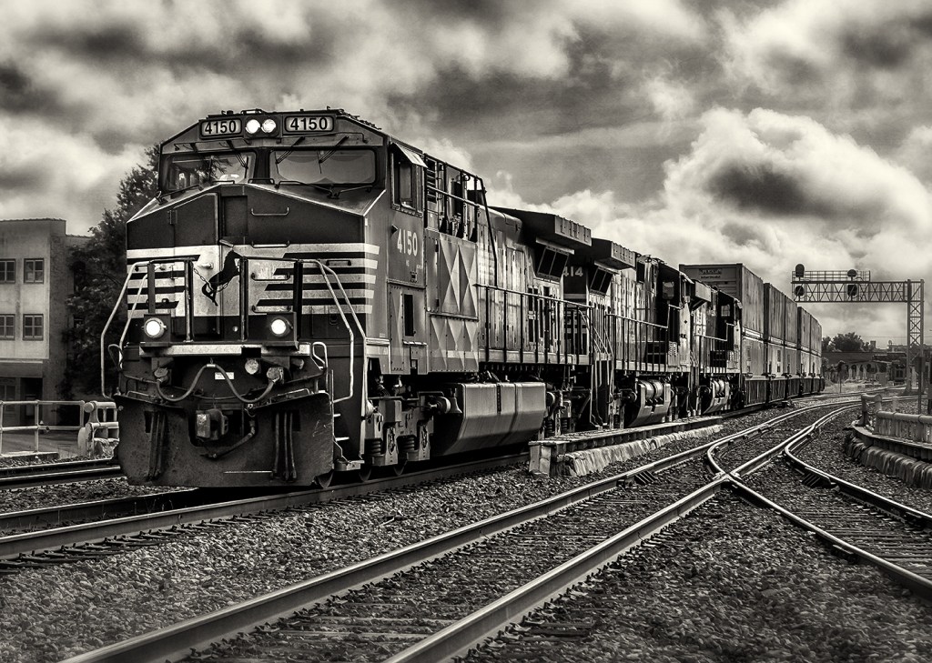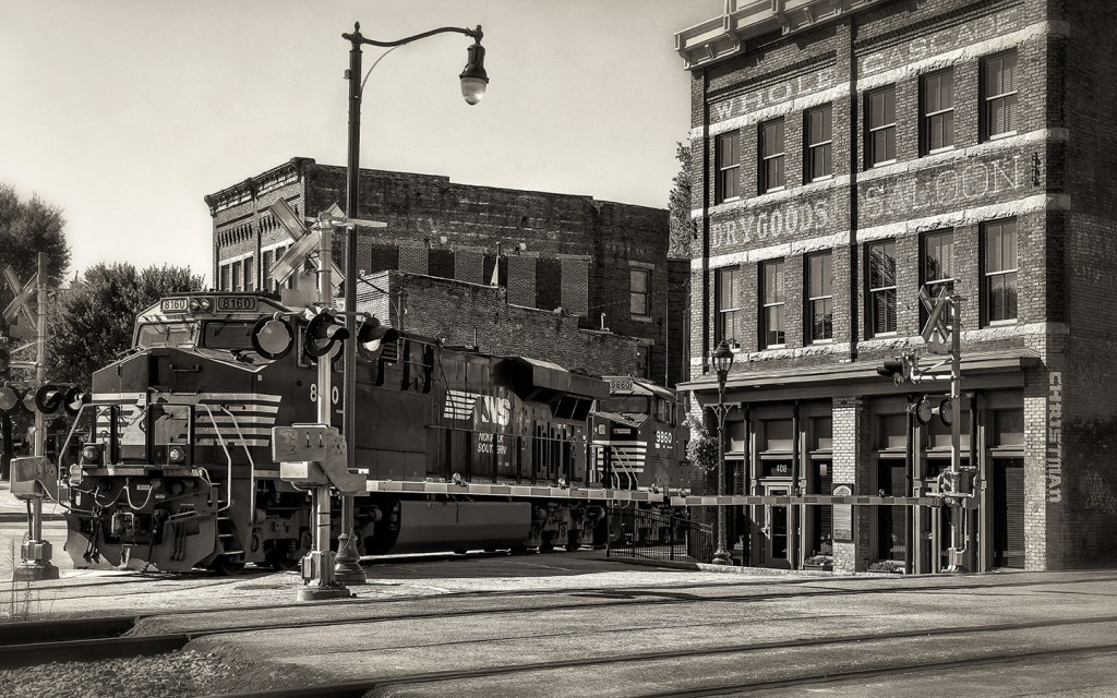 Norfolk Southern 4150 leads an intermodal train past the station and through downtown at the Elm Street crossing in Greensboro, North Carolina.