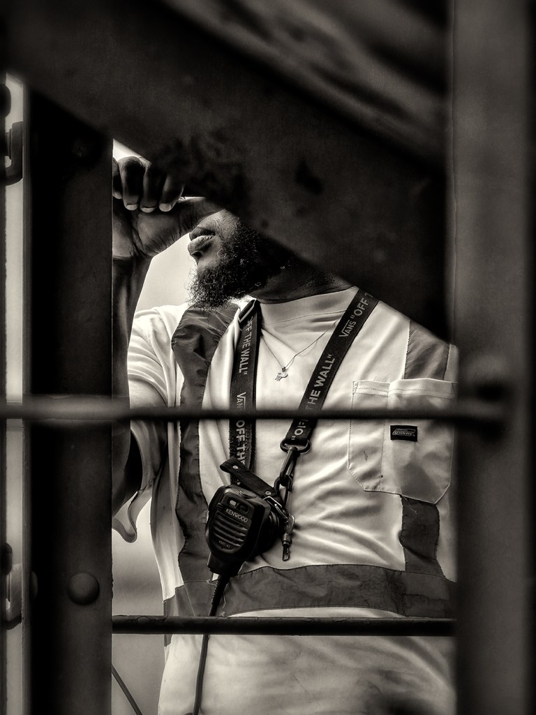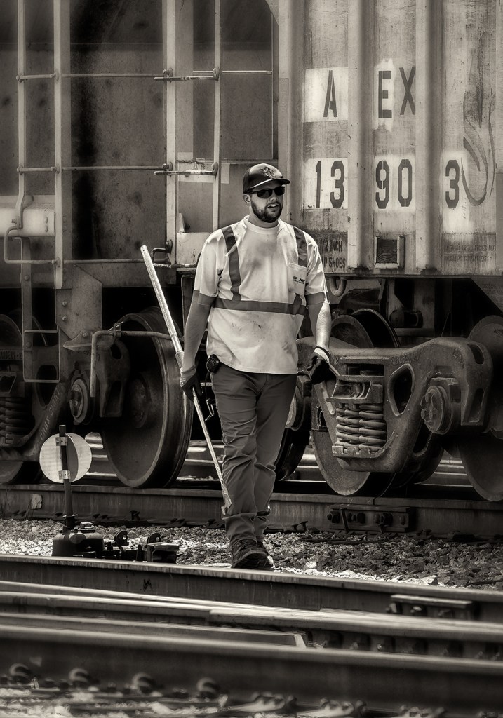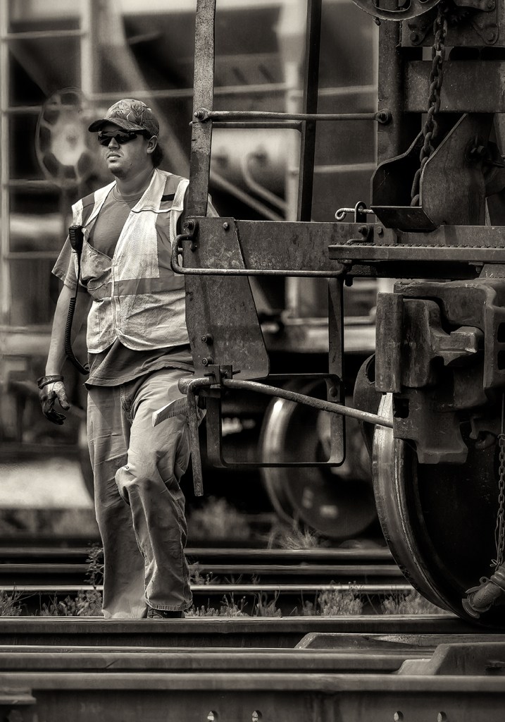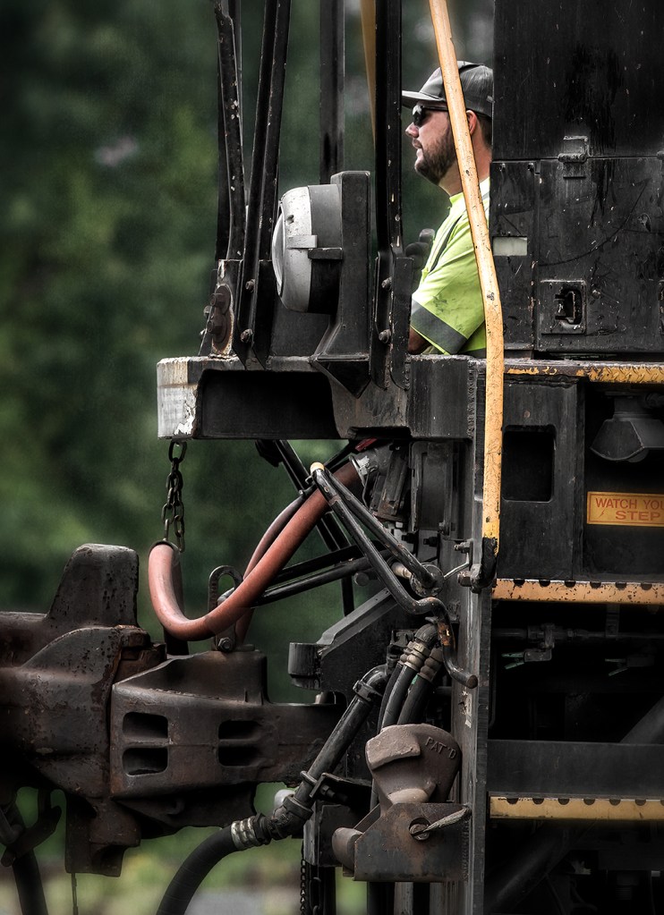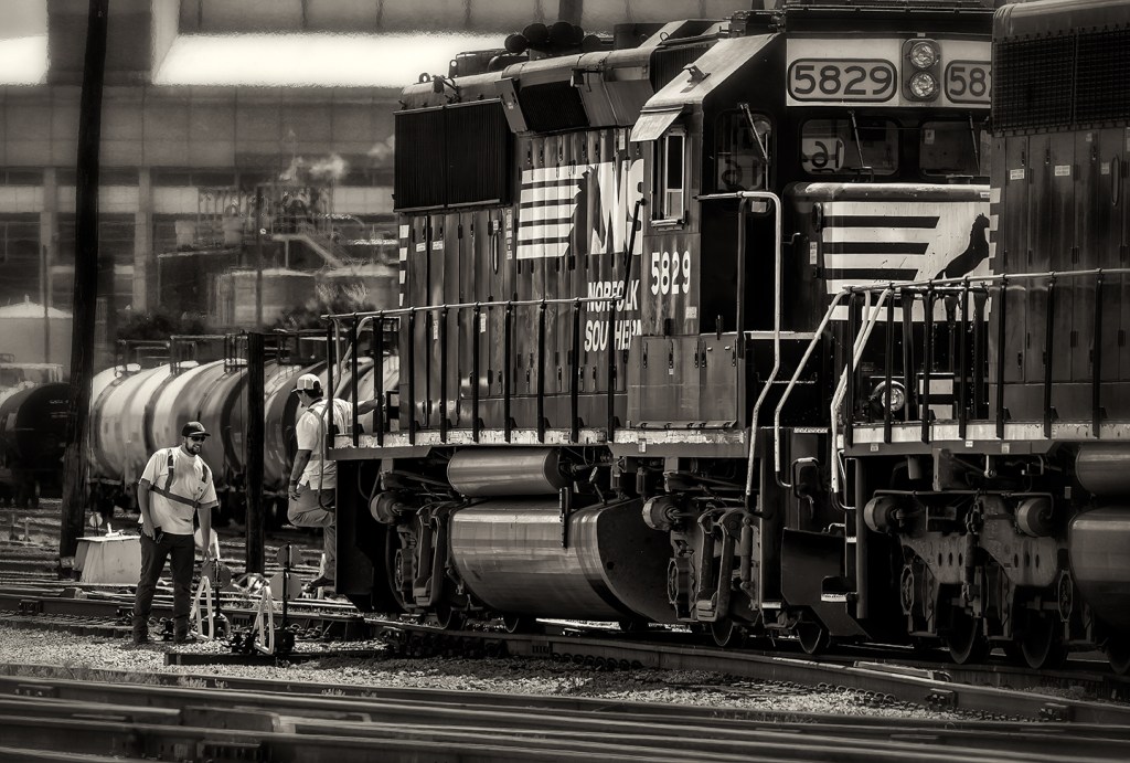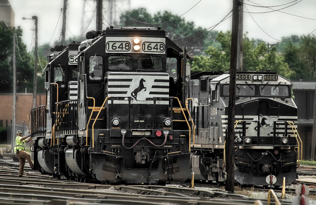 An engineer at the controls of a Norfolk Southern SD70AC locomotive switching cars in NS Pomona Yard in Greensboro, North Carolina. (Photographed for and with permission of Norfolk Southern)