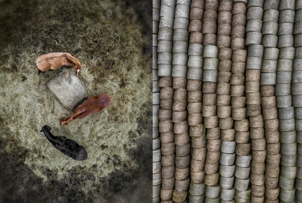 Round bales of hay being fed at Routh Ranch in Grays Chapel, North Carolina.
