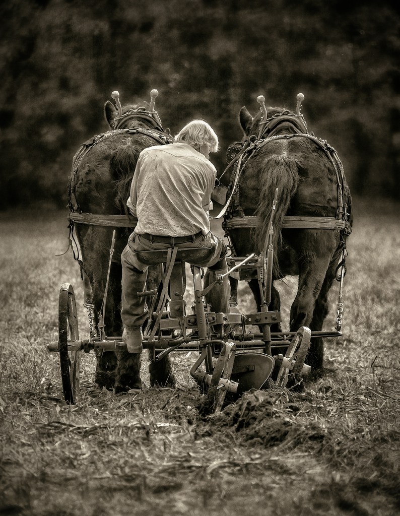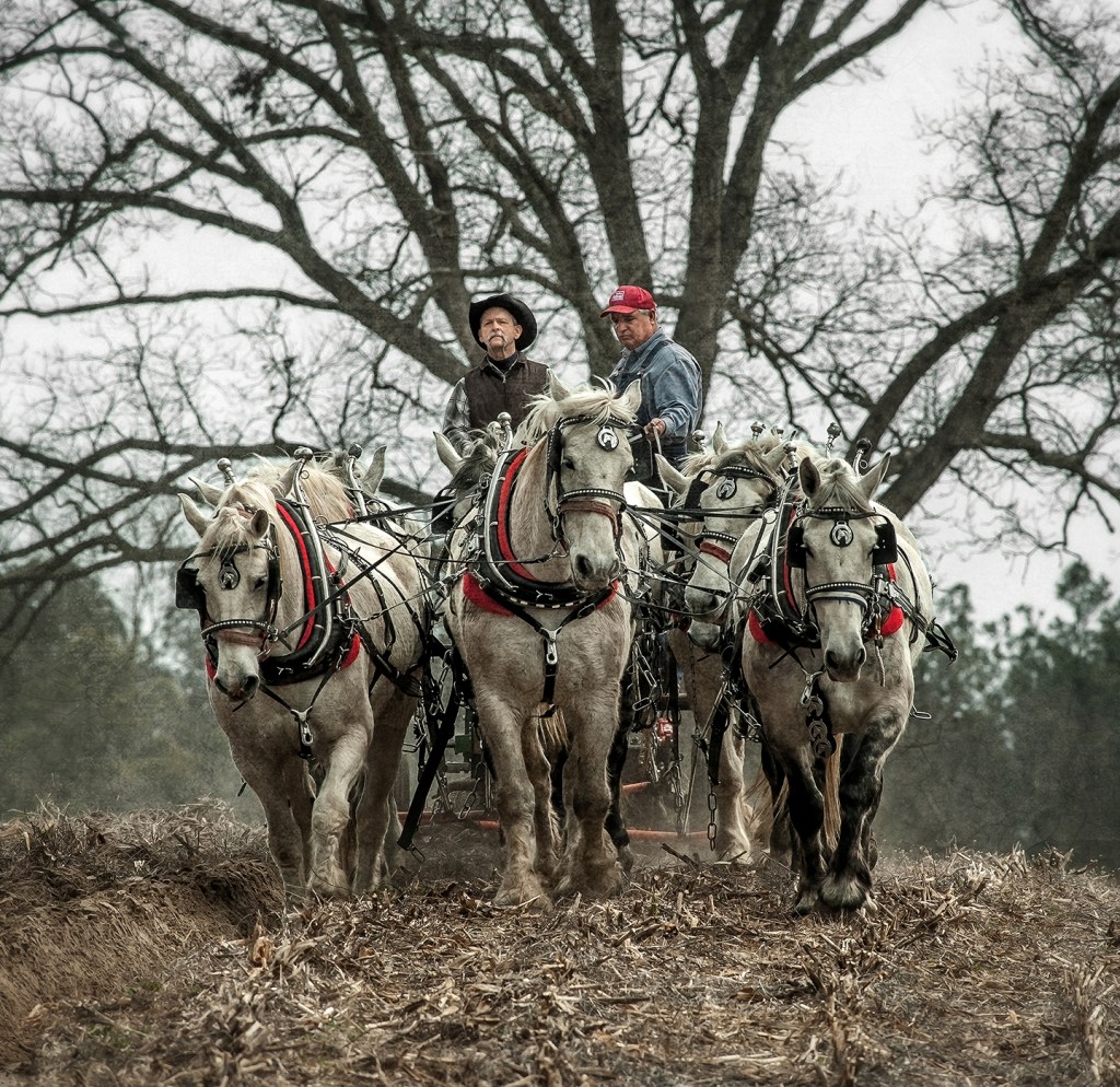 Lester Ray plows with his team of Percheron horses last Saturday at plow day at Twin Branch Farm near Chapel Hill in Orange County, North Carolina.