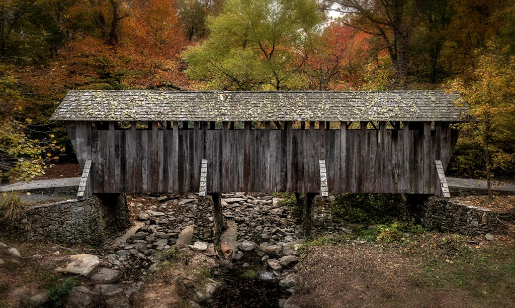 Fall color surrounds the Pisgah Covered Bridge in southwestern Randolph County, North Carolina.