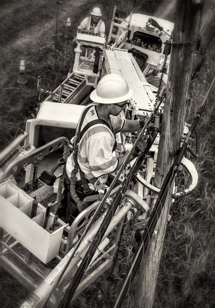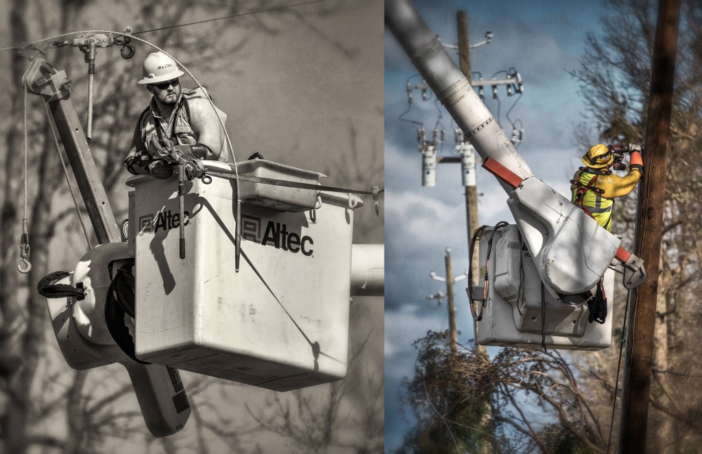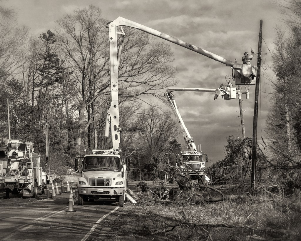 Linemen working to repair the tornado damage. Grays Chapel, North Carolina.