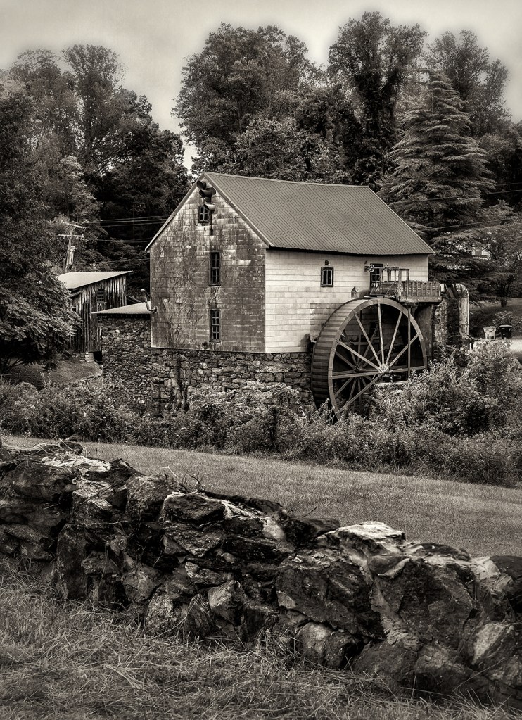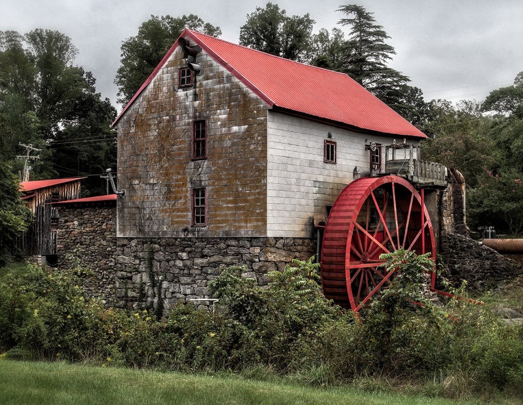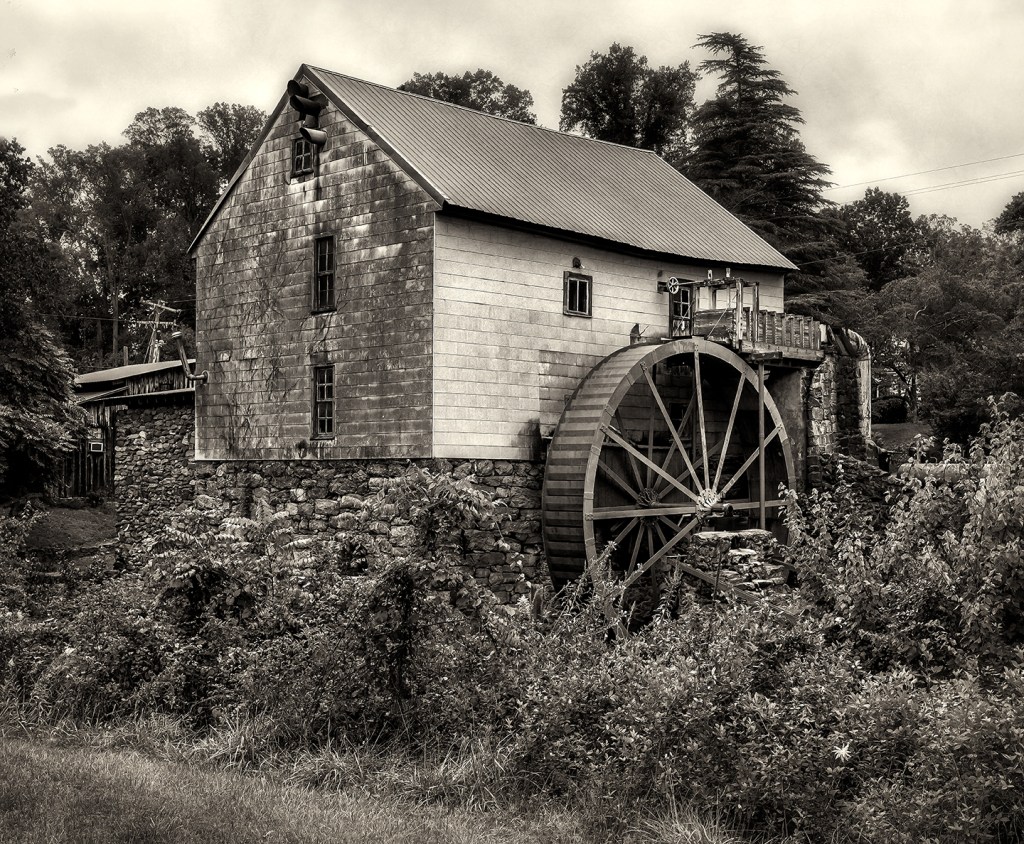 The Old Mill of Guilford, near Summerfield, North Carolina. Water will soon be turning the wheel again it seems. The pipe from the nearby millpond is being relined and the water should start flowing again. The wheel will be used to power a generator which in turn will power the mill equipment.