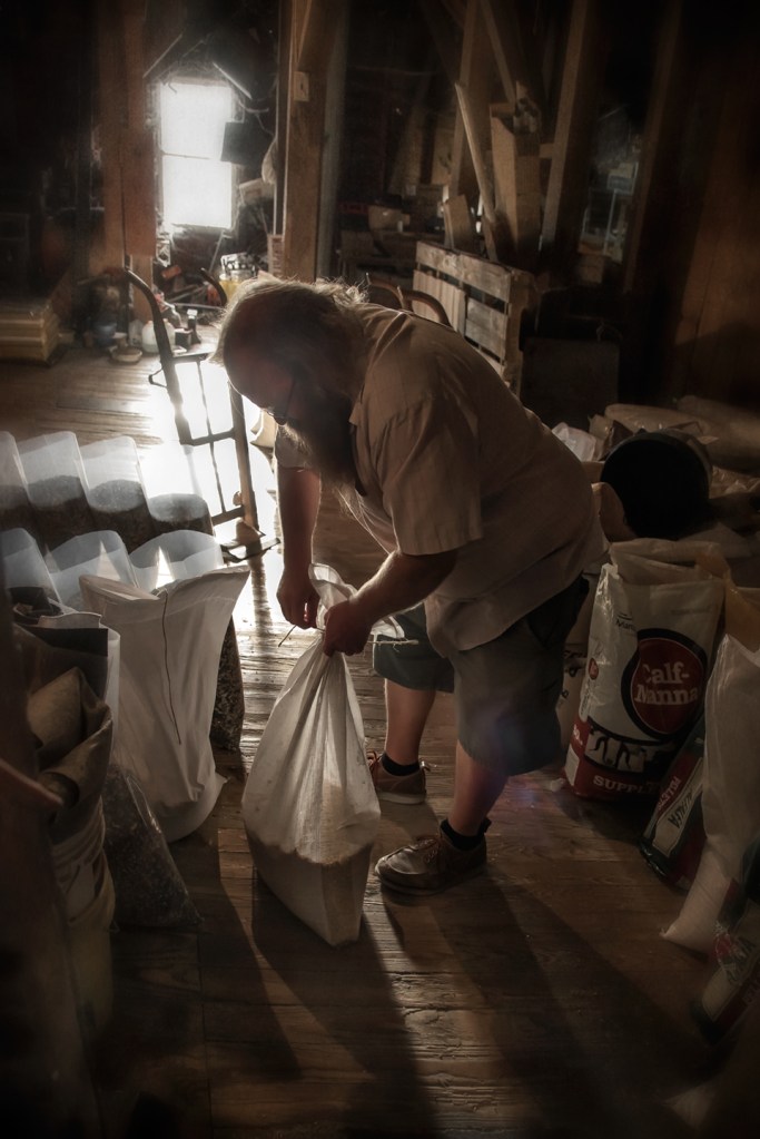 Eric Horney at work filling orders on a warm December afternoon at Julian Milling Company. Julian, North Carolina.