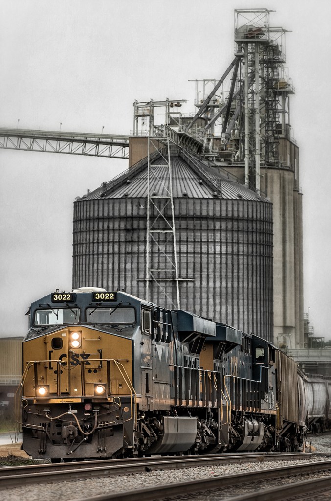 A CSX powered grain consist unloading cars at the Perdue feed mill in Candor, North Carolina on a recent winter day.