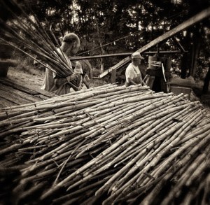 Saturday morning I went over to Gary McMasters’ farm in Grays Chapel, North Carolina to watch something my Dad used to talk about, but something I had never actually seen done. Along with neighbors Buddy McNeil, Adrian Staley, Brandon Bryson and Charlie Latham, Gary and his family were in the middle of making sorghum molasses. Gary grows the cane on his own land, then he, Buddy and Adrian cut it, strip it of its leaves, and then press the juice out of it with an antique mill powered by Gary’s mule Sam. Once the juice is collected, it’s cooked down into a syrup. On Saturday, the process started at 6 AM in the morning. Sam walked round and round till about nine and Gary collected one hundred or so gallons of juice. He then started a wood fire under a large stainless steel cooker and began to cook the liquid down. This cooking process is pretty much an all day job. Gary keeps everything at a steady boil and continuously stirs and skims pulp that floats to the surface. On Saturday it took until six in the afternoon to reduce the cane juice to a thick consistency where it could be strained and poured into jars. One hundred gallons of cane juice produced about ten gallons of finished molasses.