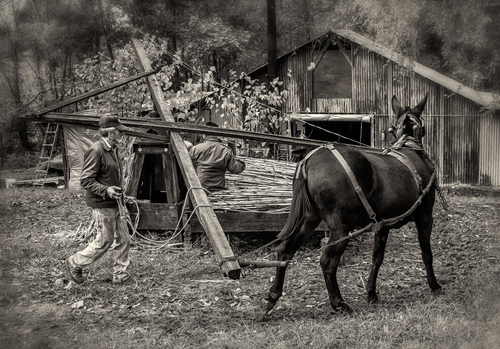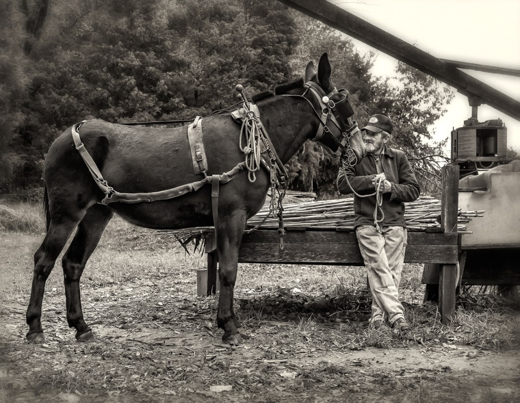 Neighbor Gary McMasters leads his mule at the sorghum mill. Grays Chapel, North Carolina.