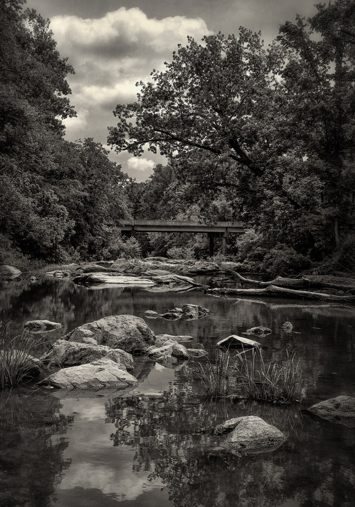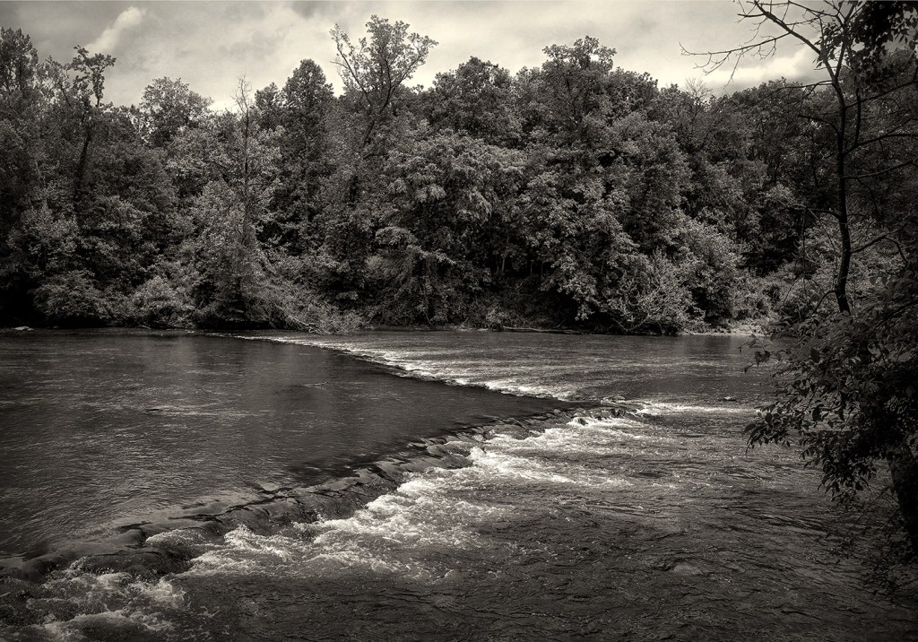 The bridge and a Native American fish weir on the Haw River in Saxapahaw, North Carolina.