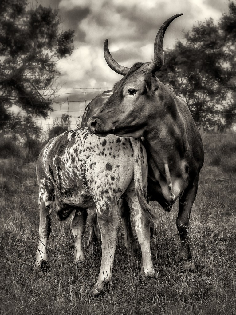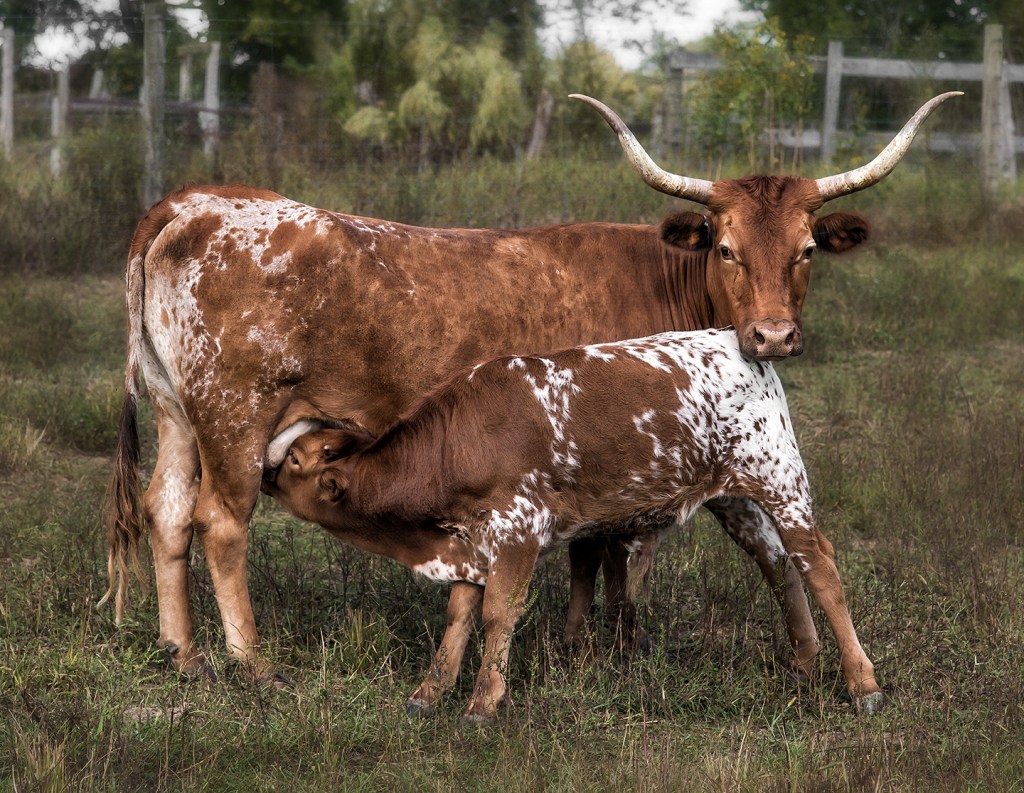 Pineywoods cow “Peaches” and her calf at Ozark Akerz Regenerative Farm near Coleridge in southern Randolph County, North Carolina.