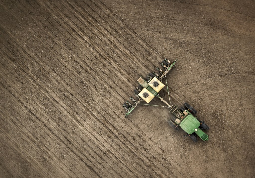 Planting soybeans in wheat stubble. Beeson Farm. Sophia, North Carolina.