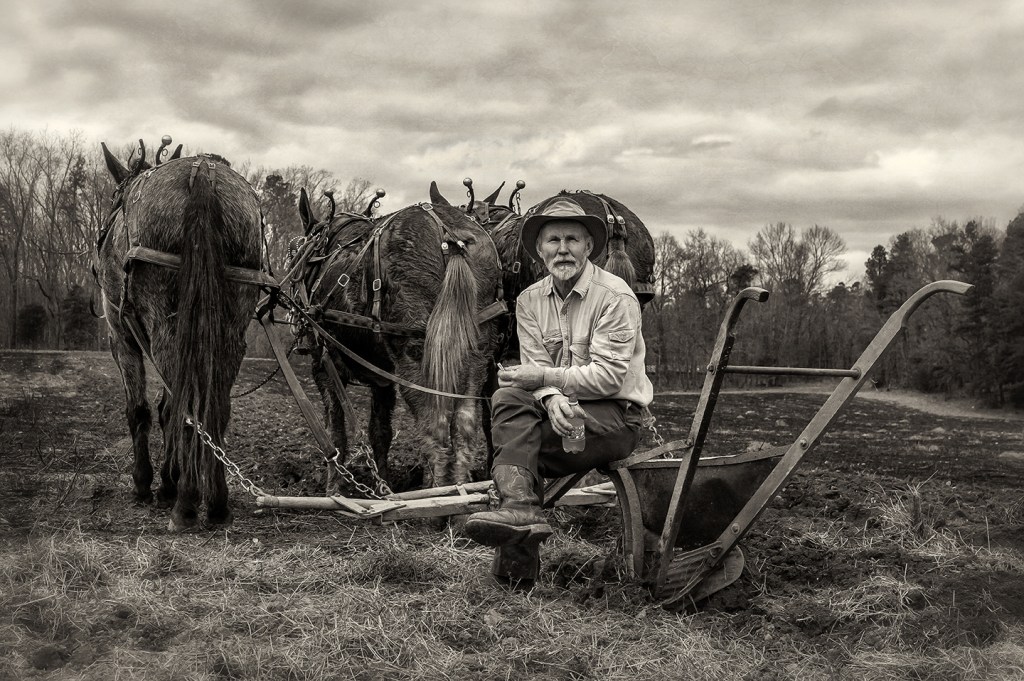 Leonard Bergey plows with his team at Twin Branch Farm near Chapel Hill in Orange County, North Carolina.