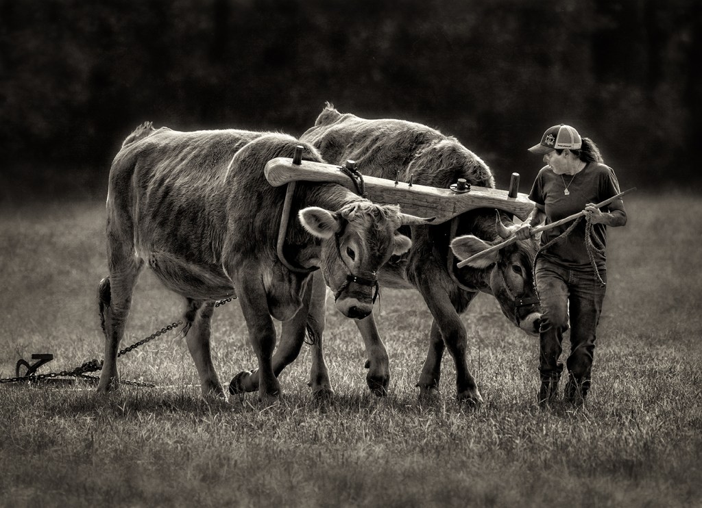 Allison Sturgill working her two Brown Swiss oxen, Gabe and Liam yesterday at the plow day at Twin Branch Farm in Orange County near Chapel Hill, North Carolina.