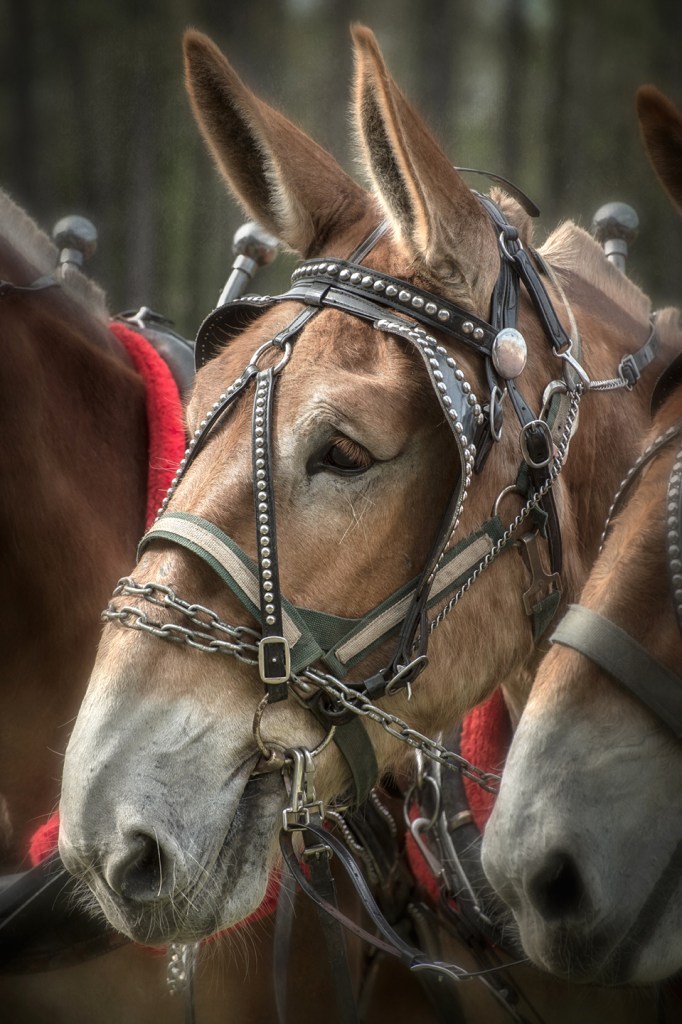 Wayne Hussey rests his three mules between rounds plowing. Near Seagrove, North Carolina.