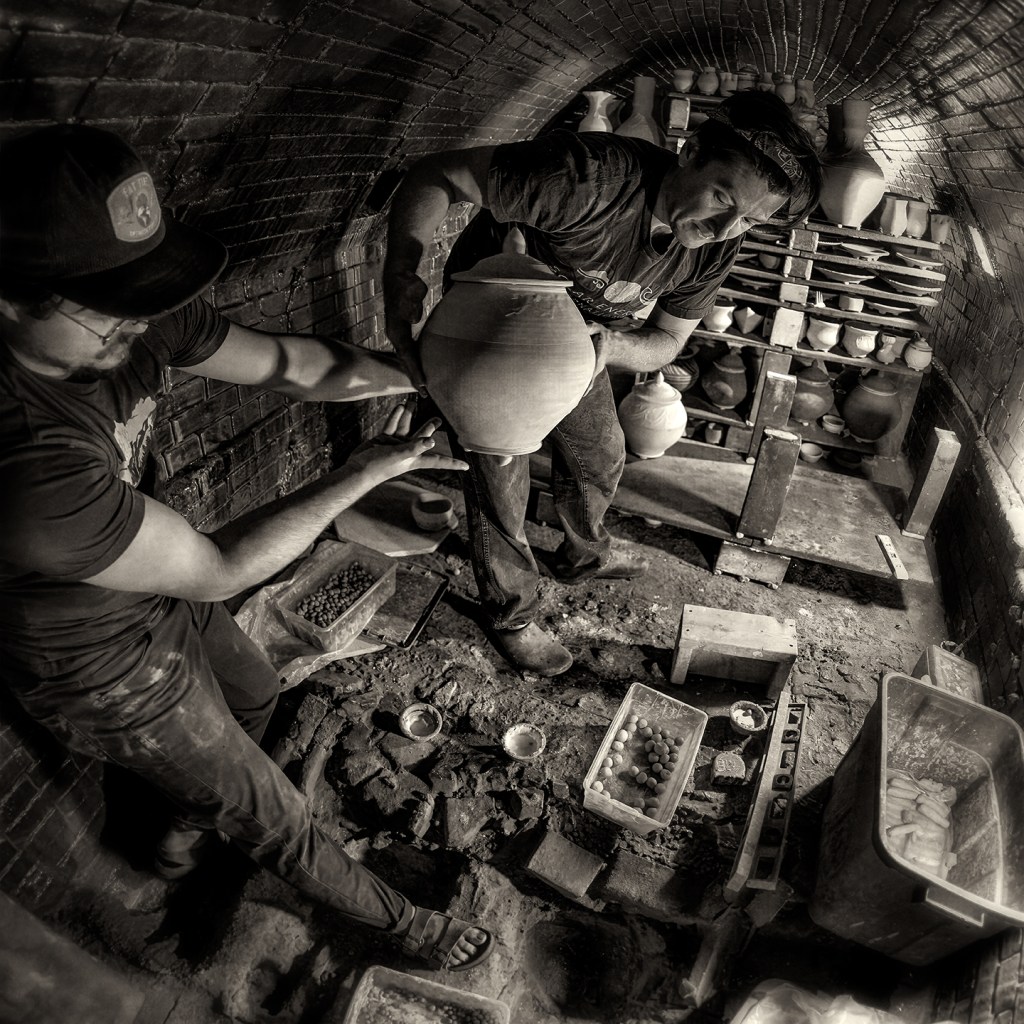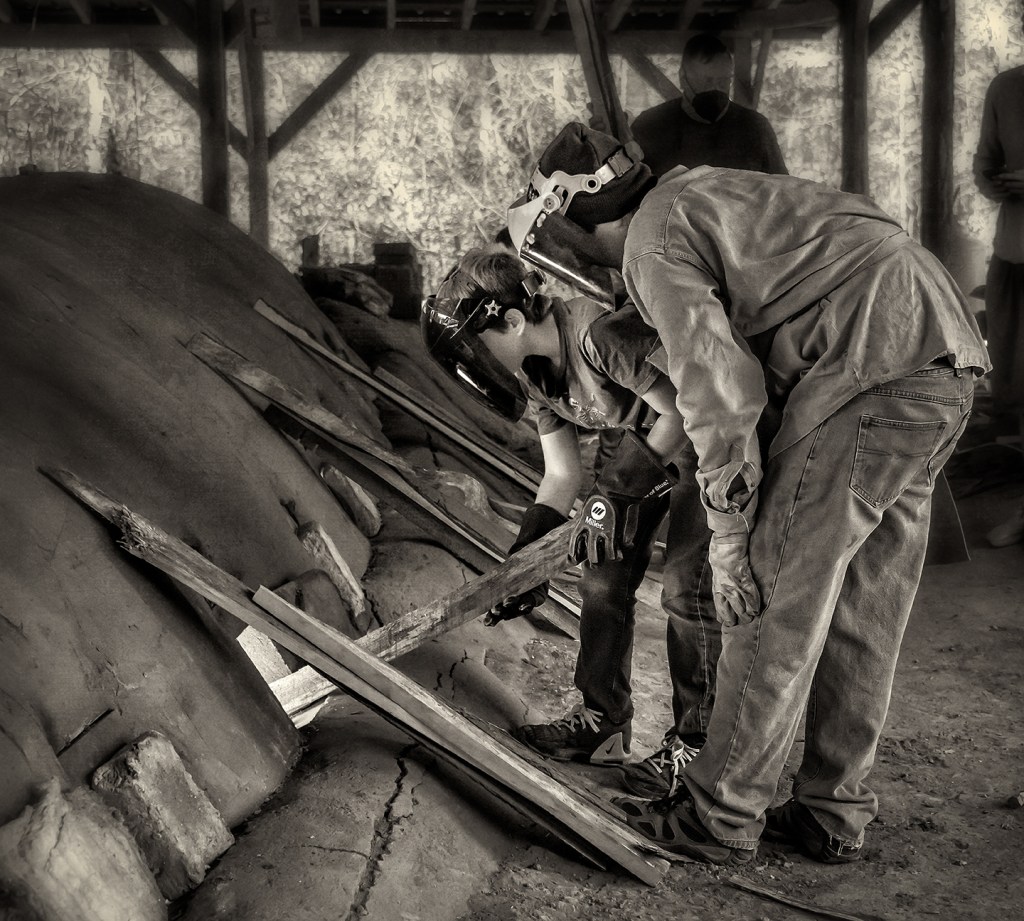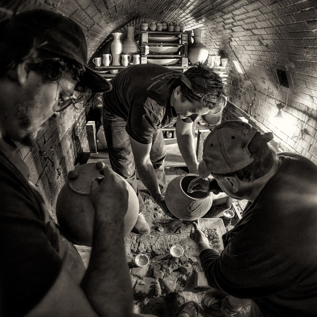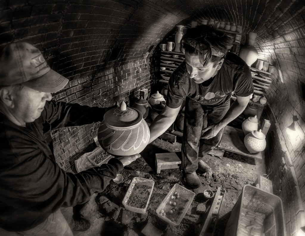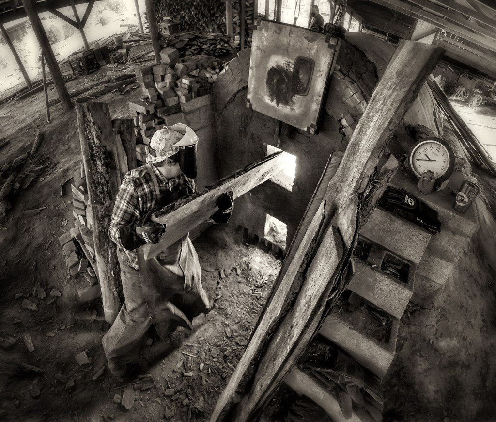 Bayle and Travis Owens unload a groundhog kiln at Jugtown Pottery in northern Moore County, North Carolina.