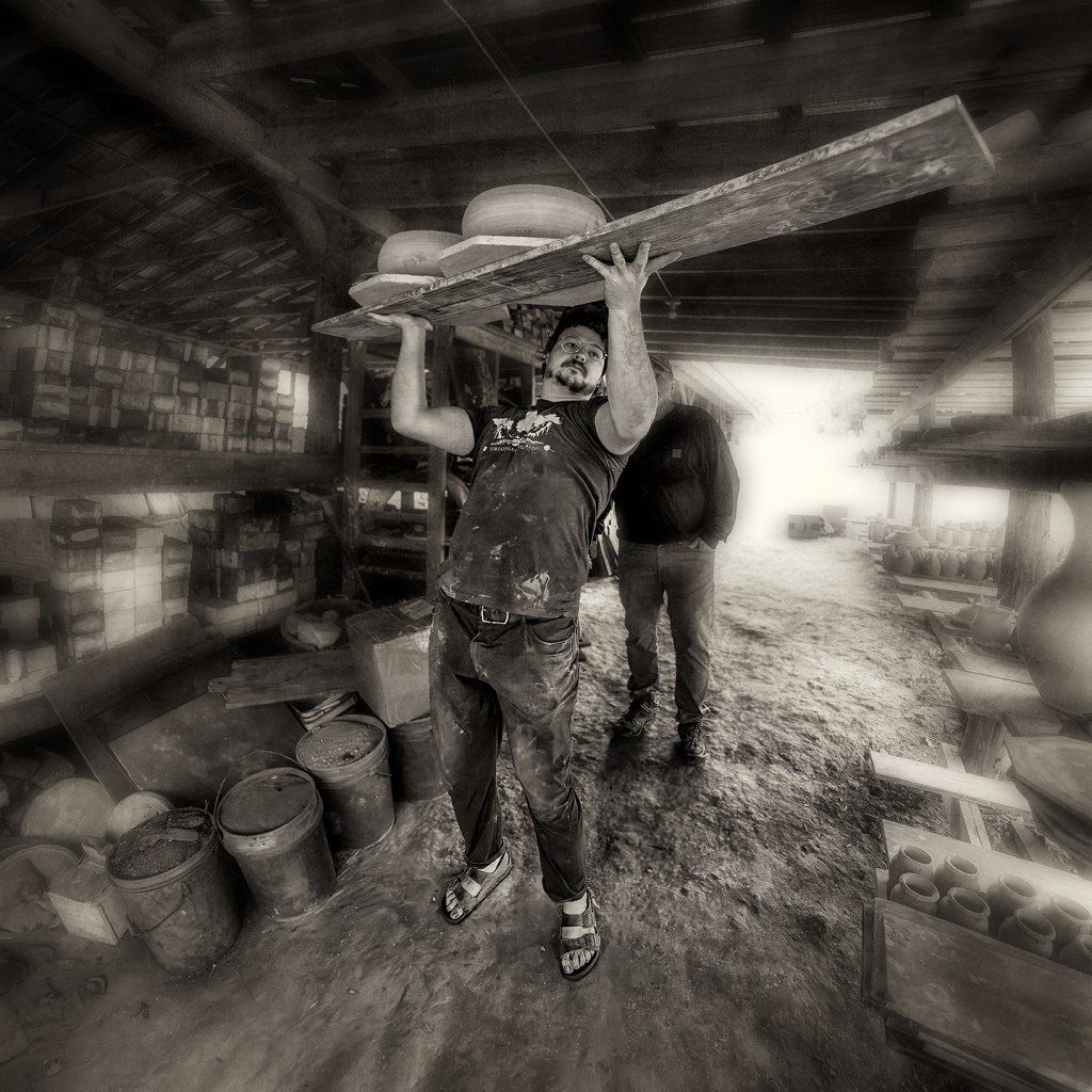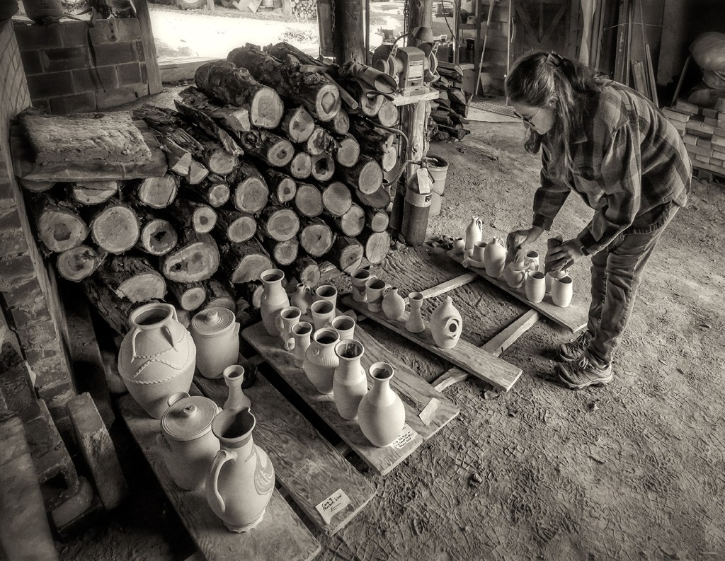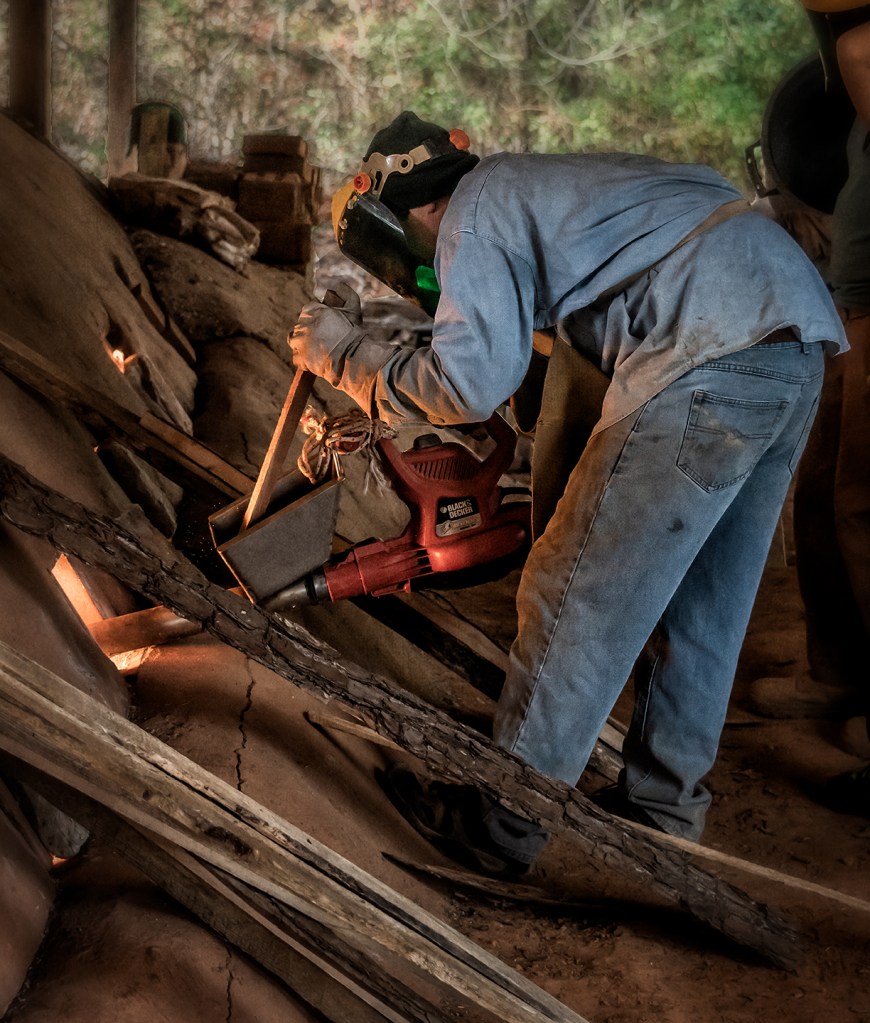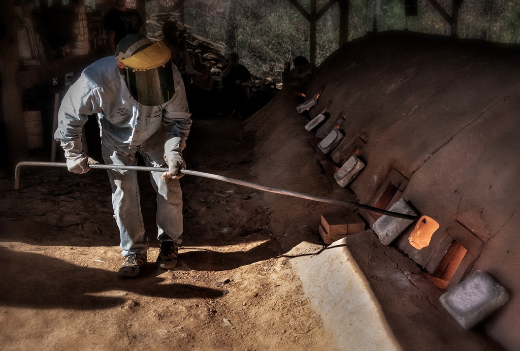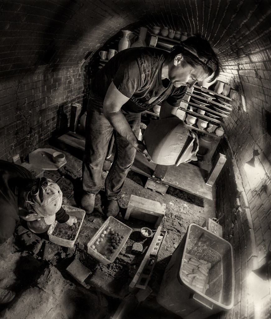 Bayle and Travis Owens unload a groundhog kiln at Jugtown Pottery in northern Moore County, North Carolina.