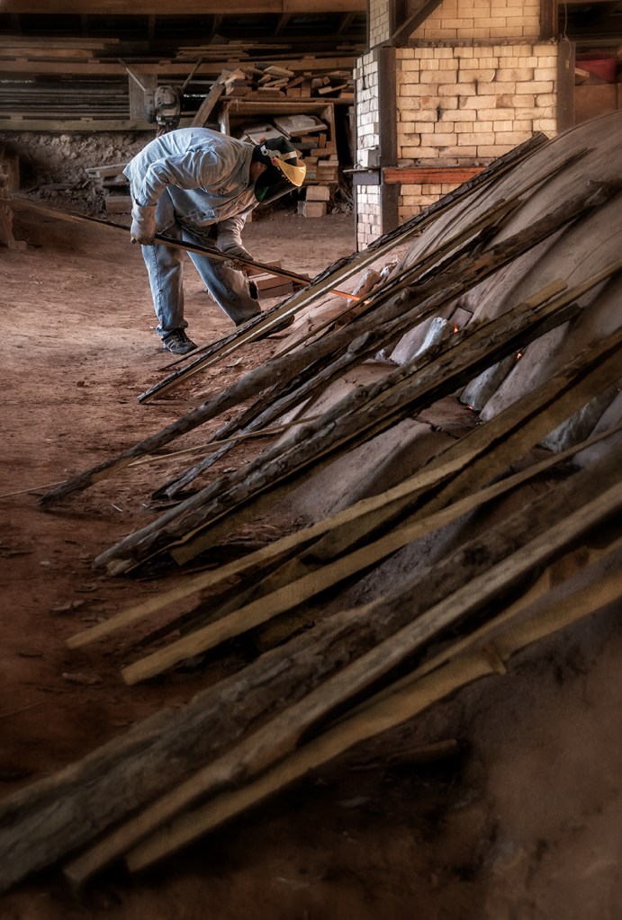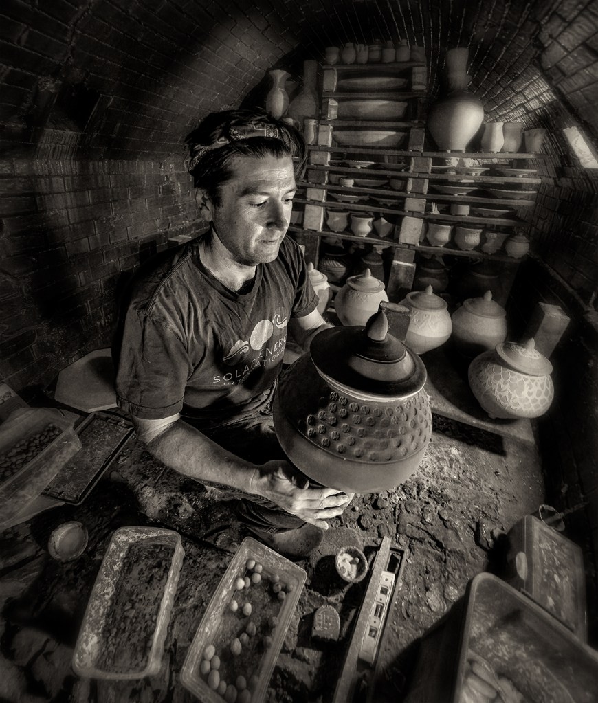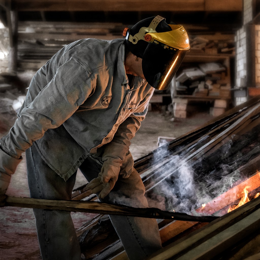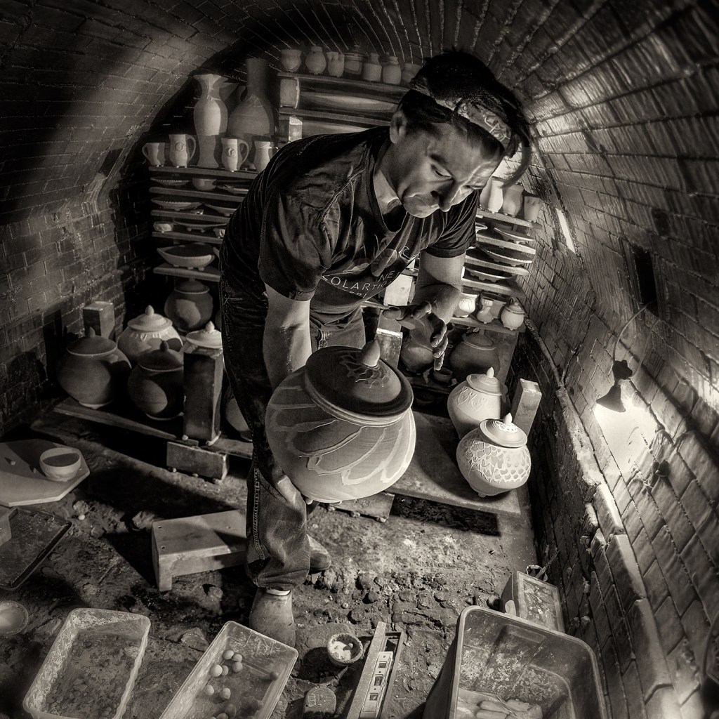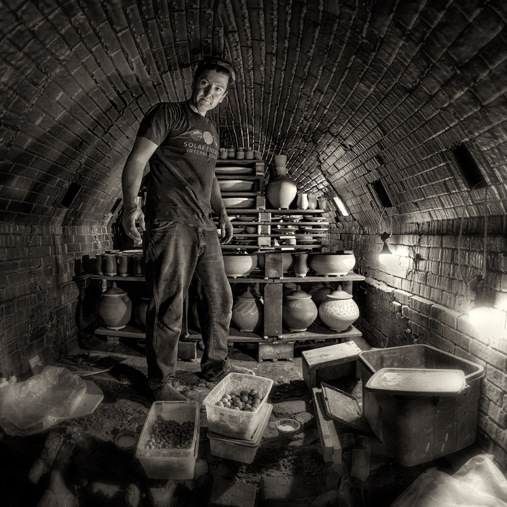 Bayle and Travis Owens unload a groundhog kiln at Jugtown Pottery in northern Moore County, North Carolina.