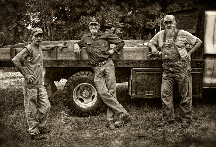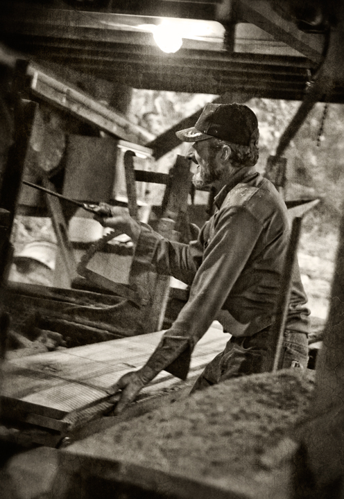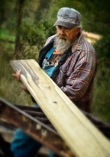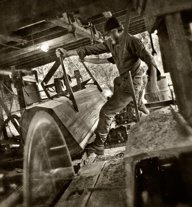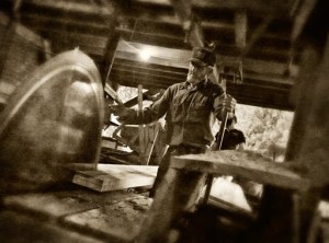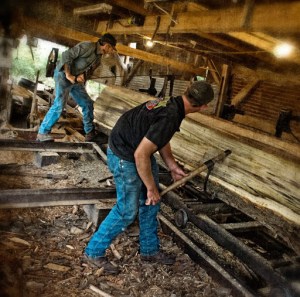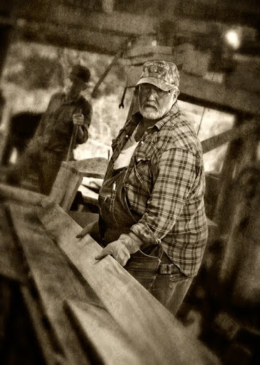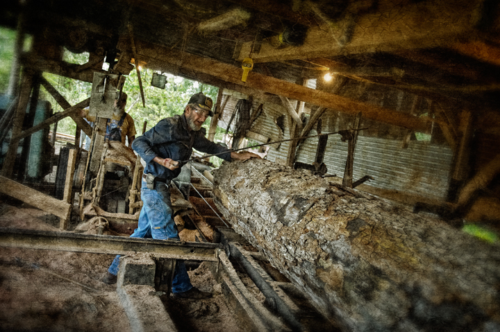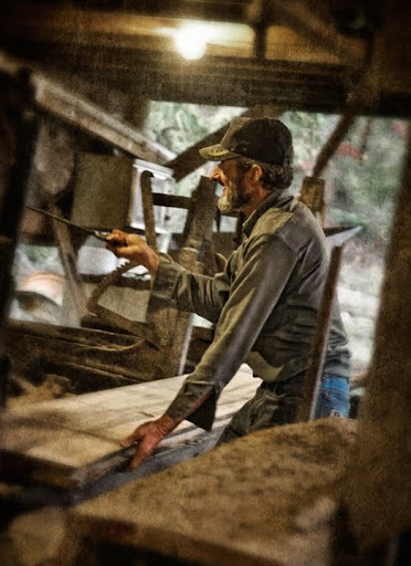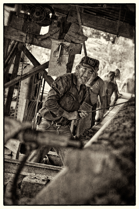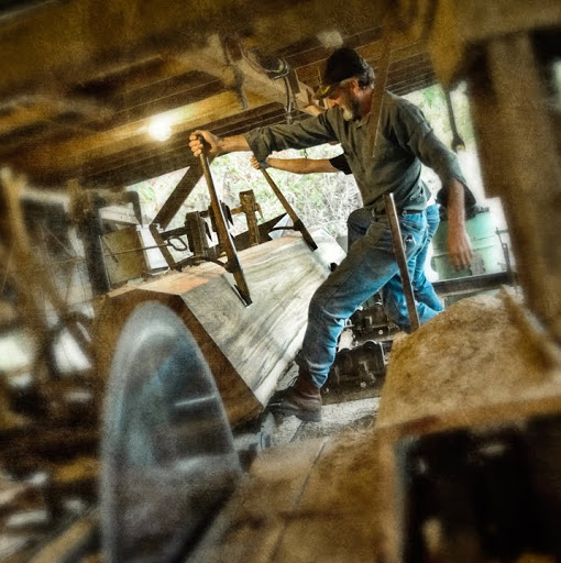 Neighbor Gary McMasters and his crew saw lumber on his vintage circular sawmill earlier this week. Gary custom saws for folks in and around Grays Chapel, North Carolina. Monday, they were sawing poplar for a local farmer for use as a floor in his barn loft. Scenes like this take me back to my childhood, when my Grandfather and my uncle ran a sawmill business with a mill very much like the one Gary uses.