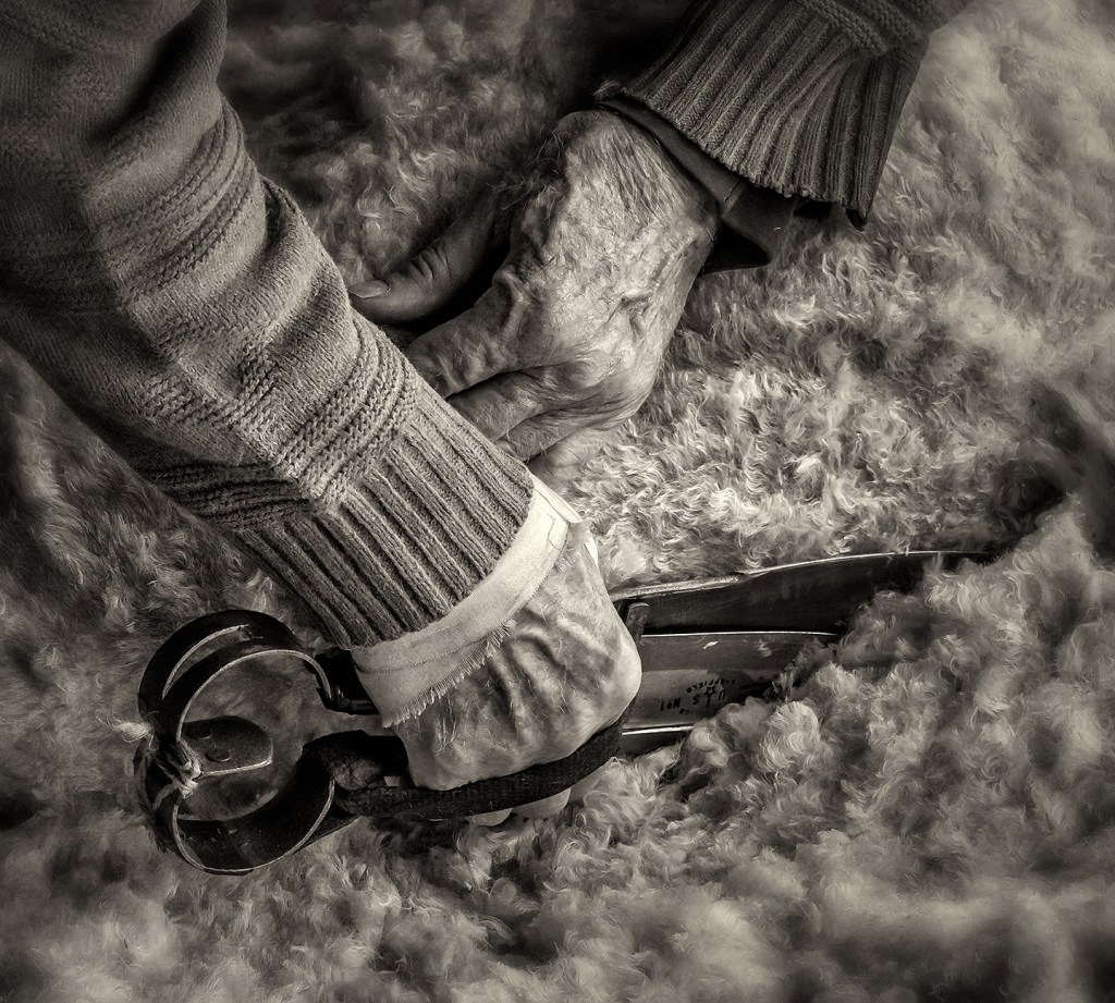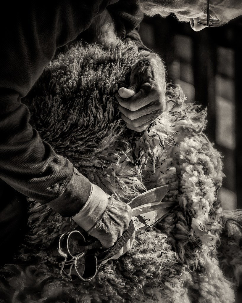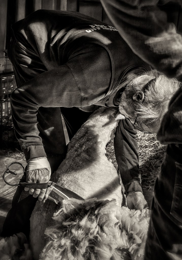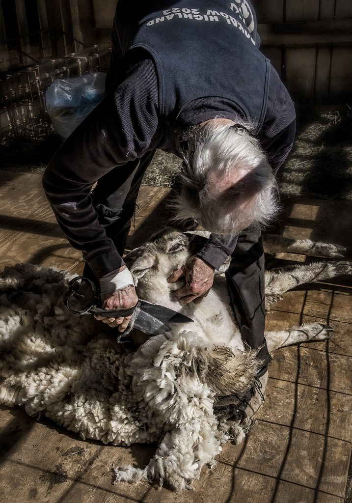 Master blade shearer Kevin Ford starts on a sheep at Rising Meadow Farm in Grays Chapel, North Carolina.