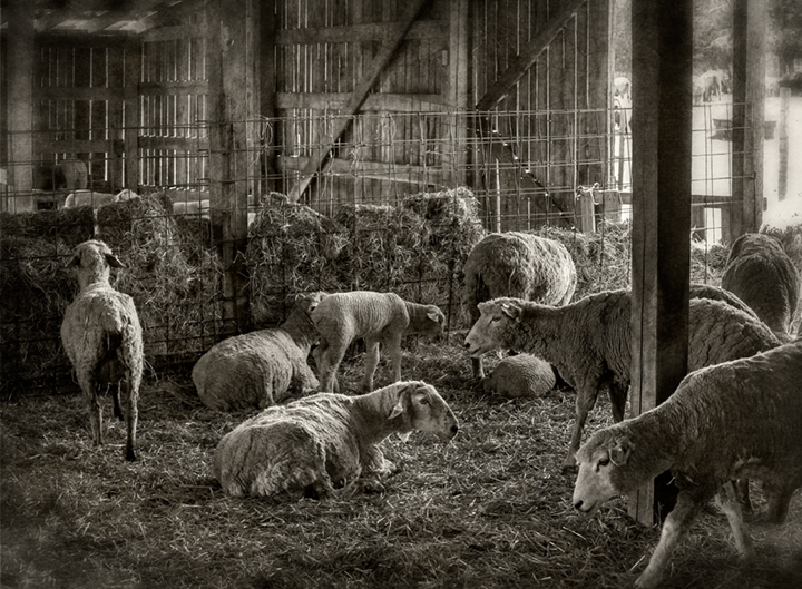 Chewing on Hay Animals, Farm, Sheep (Photograph copyright 2014 by Dan Routh) Rising Meadow Farm. Grays Chapel, North Carolina.