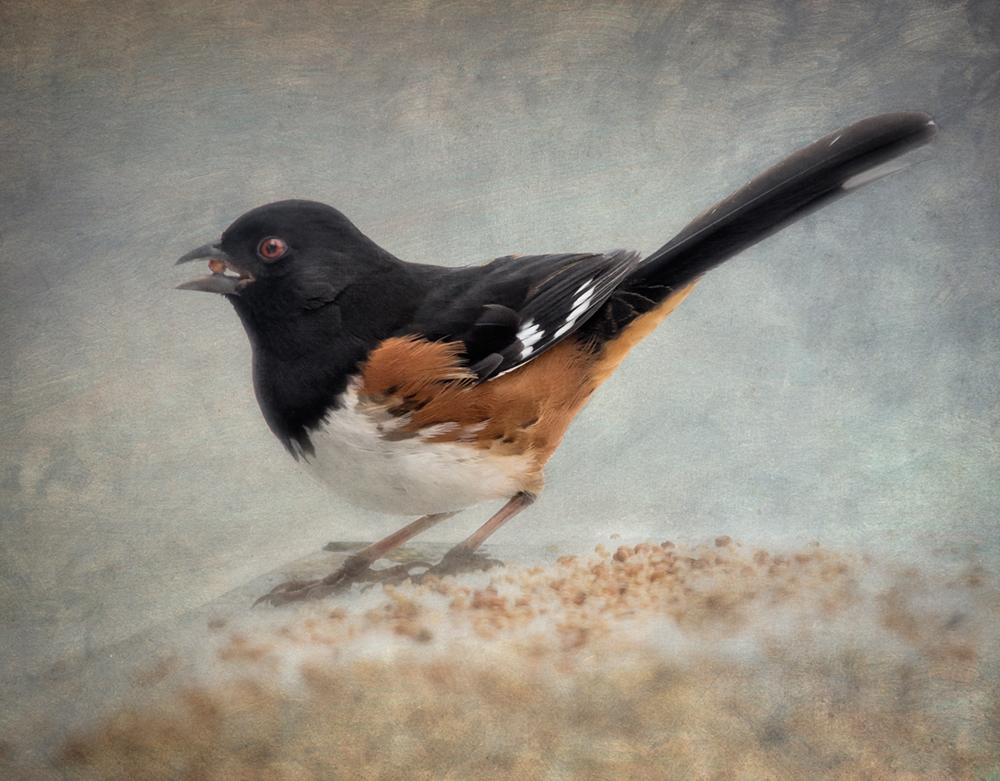 Towhee feeding. Grays Chapel, North Carolina.
