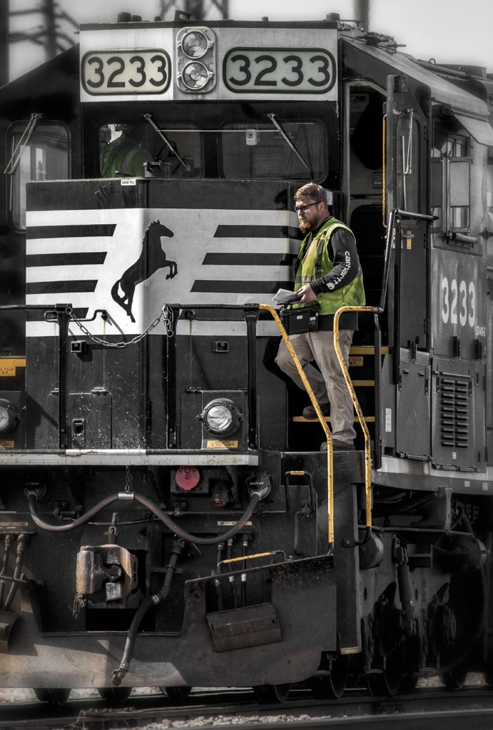 A Norfolk Southern freight drops and picks up cars on the local line south of Greensboro, near Climax, North Carolina.