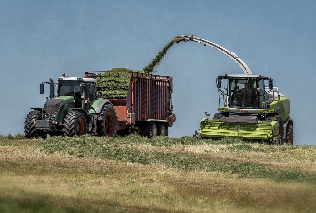 Windrowing wheat to be chopped for silage. Grays Chapel, North Carolina.