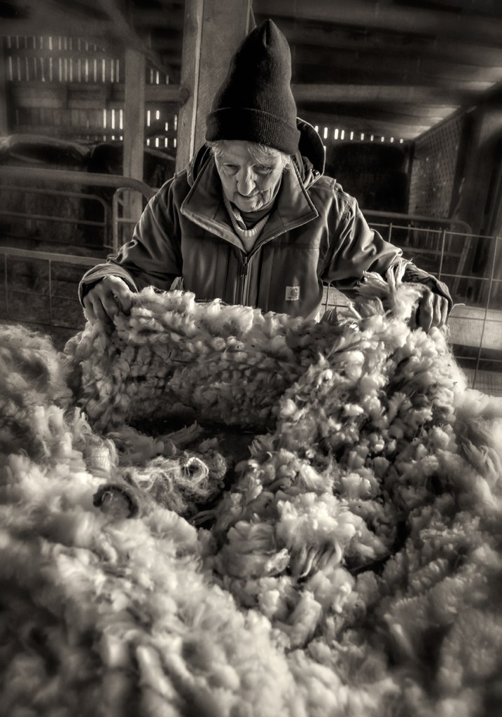 Ann Fay skirts a wool fleece after shearing on a cold day at Rising Meadow Farm, near Grays Chapel, North Carolina.