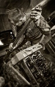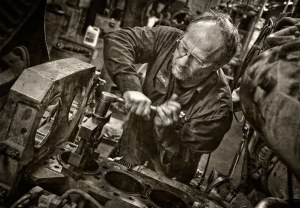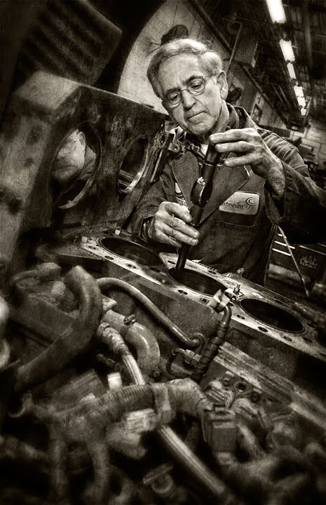 I find that a lot of my assignments involve photographing people working. A couple of weeks ago I shot a group of guys tearing apart diesel engines at a local dealership here in Greensboro. The engines were part of a long term study on oil additives and the technicians were measuring and inspecting every part for evidence of wear. Fascinating to watch these guys go through an engine literally in minutes.